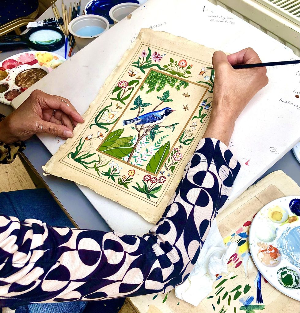 23 carat shell gold, Swarovski crystals, lapis lazuli & malachite natural pigments. Gouache on handstained Indian Wasli paper. 21cm x 30 cm 8” x 12”
